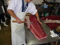 ![]() | 6月になり、天然のマグロのシ―ズンが やって来ました。30キロの小さい物から 200キロの大きい物までいろいろありますが 脂がのるにはもう少しかかりそうです★ 写真は150kのマグロの大きな顔ですよ(Chu) |