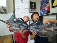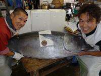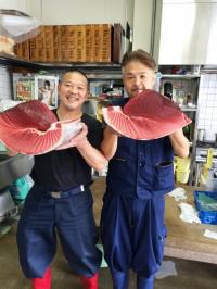 ![]() | 1本釣りの大間の本マグロが毎日入荷しています。 水温も低くなり、身のしまり、脂の質も良くなってきました。 値段も味も食べ頃です。写真は150k近い釣りの大間の本マグロです。 2人とも笑顔ですが、かなり重くて若干無理してます(笑) |